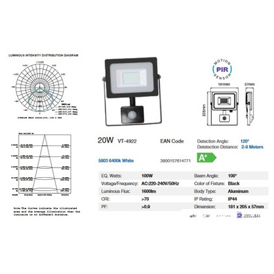 20W LED Sensor Floodlight Black Body SMD 6000K "blanca" (foco-proyector) V-