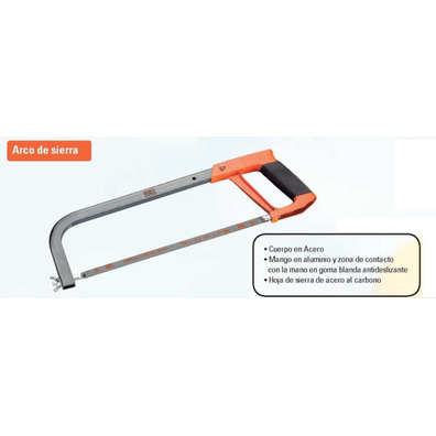 Arco de sierra con estructura de acero. Ajuste de tensión por leva. Mango de aluminio. Mango y zonas de contacto con goma blanda antideslizante. Incluye una hoja de sierra de 300 mm. De acero al carbono.