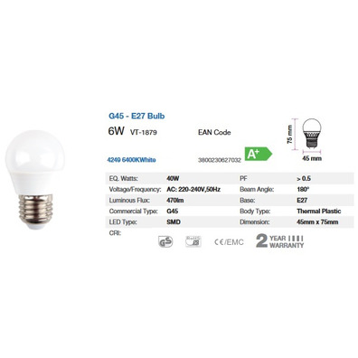 BOMBILLA LED Bulb - 6W E27 G45 6000K "blanca" V-TAC