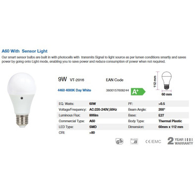 iva incl.BOMBILLA LED Bulb-9WE27A60 Thermoplastic Sensor 200D4000KDay "blanca" 2UDS