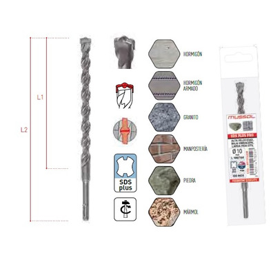 Las brocas SDS PLUS Ø 10x450 de MUSSOL son la herramienta perfecta para perforar hormigón, piedra y materiales similares con precisión y eficacia. Con un diámetro de 10mm y una longitud de 450mm, estas brocas están diseñadas para brindar un rendimiento excepcional en aplicaciones de construcción y obras civiles.