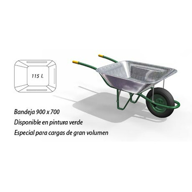 Carretilla reforzada para trabajos de construcción y jardinería. Su ligereza y su peso aportan un fácil manejo en su transporte. La herramienta dispone de rueda neumática y una bandeja metálica galvanizada.