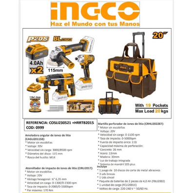COMBO AMOLADORA+COMBINADO+IMPACTO+BAT 4AH+BOLSA RIGIDA INGCO