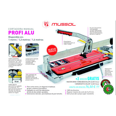 CORTADORA CERAMICA MANUAL 160cm (aluminio) corta 163cm + 2 discos