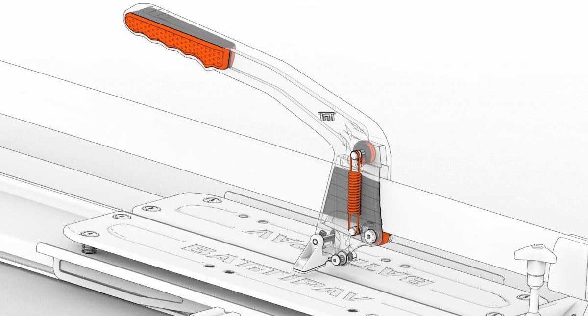 - Muelles especiales para cada lado para permitir una rápida rotura de los azulejos cortados. Pie de rotura: fabricado en aluminio con un protector de goma blanco en la base para evitar arañazos en la superficie de la baldosa durante el proceso de rotura.