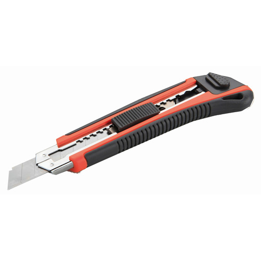 Cúter con mango de plástico con diseño ergonómico y antideslizante y guías metálicas portacuchillas. Cuchilla de acero SK5 de 18 mm. fragmentable en 8 filos de corte aprovechable.