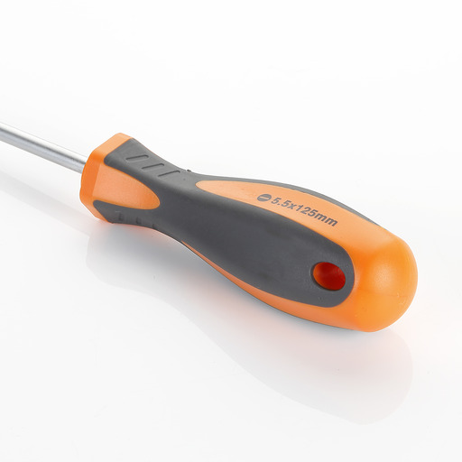 Destornillador de varilla cilíndrica con punta negra imantada y mango bimaterial ergonómico. Fabricado en Acero al Cromo-Vanadio, lo que le da una dureza y larga vida de uso. El tratamiento térmico equilibra la dureza y elasticidad necesaria en cada zona. Así, la punta tiene una dureza superior. La varilla esta tratada con tratamiento superficial de cromado para alargar la vida de la herramienta, y evitar la corrosión. La punta además esta imantada para facilitar la colocación del tornillo, o facilitar su extracción.