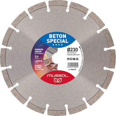 Disco de diamante para corte en seco o húmedo con amoladora y también para máquinas de mesa y máquinas de gasolina. Muy buen general de obra segmentado láser. Corta hormigón armado. Gran rendimiento. Disco de diamante segmentado. Altura de segmento 10 mm. Soldadura láser. Alta calidad para profesionales exigentes. EN-13236.