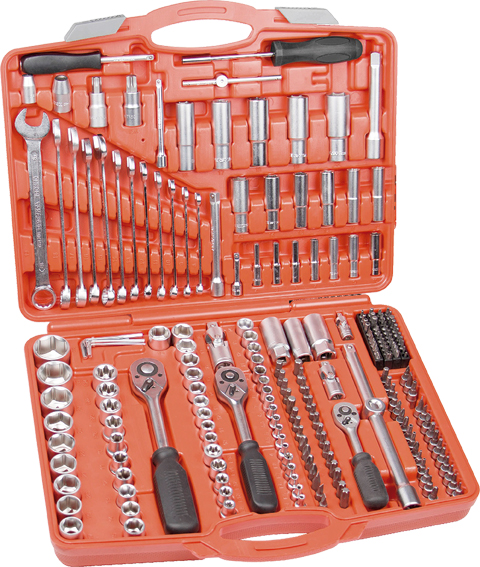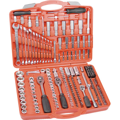 iva incl.Peso: 11450 gramos. Dimensiones caja: 540x400x110 mm. Fabricado en Acero Cr-V. Terminación satinado mate. Caja de plástico con bisagra central reforzada. Carraca 45 dientes. Composición 1/2": 1 carraca 1/2" / 1 junta universal 1/2" / 1 alargadera 1/2" de 175 mm / 1 alargadera 1/2" de 250 mm / 1 adaptador 1/2" M x 3/8" H / 1 adaptador vasos 1/2" puntas 5/16" / 15 vasos 1/2": 10, 11, 12, 13, 14, 15, 17, 19, 20, 21, 22, 24, 27, 30 y 32mm / 5 vasos 1/2" largos: 16, 17, 18, 19 y 22 mm / 4 vasos 1/2" Torx hembra: E18, E 20, E22 y E24 / 2 vasos 1/2" punta Torx: T50 y T55. Composición 1/4": 1 carraca 1/4" / 1 junta universal 1/4" / 1 mango en T de 1/4" / 1 adaptador vasos 1/4" con mango / 1 adaptador puntas 1/4" con mango / 1 alargadera 1/4" de 75 mm / 1 alargadera 1/4" de 125 mm / 1 adaptador vasos 1/4" puntas 1/4" / 13 vasos 1/4": 4, 4’5, 5, 5’5, 6, 7, 8, 9, 10, 11, 12, 13 y 14 mm / 7 vasos 1/4" largos: 4, 5, 6, 7, 8, 9 y 10 mm / 5 vasos 1/4" Torx hembra: E4, E5, E6, E7 y E8 / 30 vasos 1/4" con punta: 4 planos, 3 Phillips, 3 Pozidrive, 4 hexagonales, 8 Torx y 8 Torx inviolables. Composición 3/8": 1 carraca 3/8" / 1 junta universal 3/8" / 1 alargadera 3/8" de 150 mm / 10 vasos 3/8": 10, 11, 12, 13, 14, 15, 16, 17, 18 y 19 mm / 6 vasos 3/8" largos: 10, 11, 12, 13, 14 y 15 mm / 5 vasos 3/8" Torx hembra: E8, E10, E12, E14 y E16. 12 llaves combinadas: 8, 9, 10, 11, 12, 13, 14, 15, 16, 17, 18 y 19 mm. 30 puntas 5/16": 3 planas, 4 Phillips, 4 XZN, 5 hexagonales y 14 Torx. 45 puntas 1/4": 3 planas, 4 Phillips, 4 Pozidrive, 4 hexagonales, 5 Torx, 14 Torx inviolables, 3 con dos puntos 3 XZN, 3 con tres aspas y 2 cuadradas. 3 vasos de bujías: 16, 18 y 21 mm. 9 llaves allen.