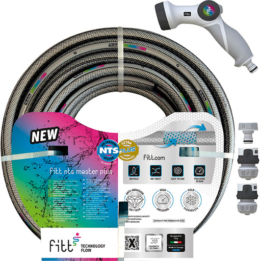 iva incl.Manguera de 5 capas con refuerzo patentado NTS PLUS. El refuerzo helicoidal de doble punto confiere a la manguera estabilidad total en cualquier condición, ningún nudo, ninguna torsión, manejabilidad extrema. Materiales sin bario-cadmio-plomo. Antialga y anti-UV. Incluye: juego de racores trimaterial con adaptador de grifo, 2 racores (1 con aquastop) y lanza de riego regulable.