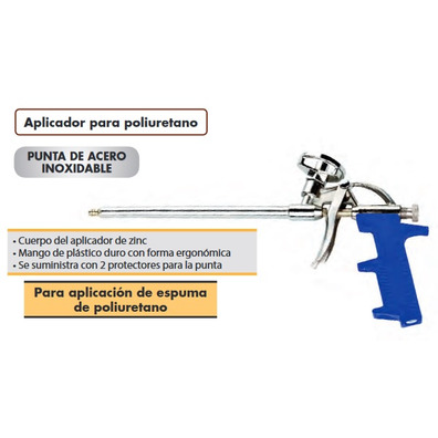 Sistema de presión desde el cartucho y de salida regulada por el gatillo y la rosca trasera que puede regular el caudal de salida. El aplicador consta de una conexión estanca al cartucho de espuma de PU, un gatillo regulador del caudal de salida, una tuerca que permite regular la amplitud de salida del gatillo, un tubo hueco y una punta que permite la salida de la espuma, según la presión que ejercemos sobre el gatillo. La conexión metálica con el cartucho es universal. La espuma es líquida bajo presión, por tanto mientras está en el cartucho y en el tubo y no hay aire, se mantiene líquida.