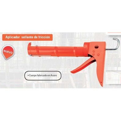 Sistema de presión mediante fricción por gatillo, leva y varilla con tope cilíndrico. El aplicador consta de un alojamiento metálico para cartuchos de 310 ml, mango con gatillo y leva de liberación rápida de la varilla. El portacartuchos es de acero, para mayor duración y capacidad de soportar la presión. La varilla cuenta con pletina de apoyo para el cartucho, ranuras para recorrido en contacto con la leva de avance y final curvo para facilitar el retroceso de la varilla. La pletina de fricción es de acero lo que le da más duración y más resistente. El aplicador es apto para cartuchos de masas de baja y media densidad. Aplicador económico de buenos resultados, larga vida y alta efectividad de uso.