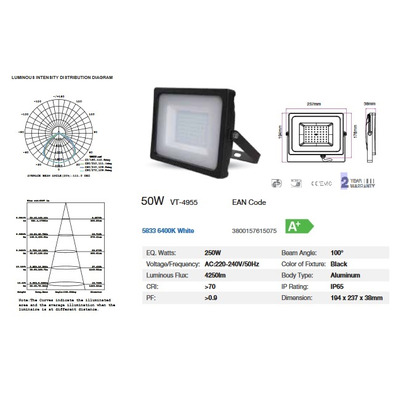 El PROYECTOR 50w LED CHIP SAMSUNG 6400K V-TAC cuenta con un diseño robusto y resistente, perfecto para resistir las condiciones adversas del exterior. Su construcción de alta calidad garantiza una larga vida útil y un rendimiento constante sin comprometer la eficiencia energética.
