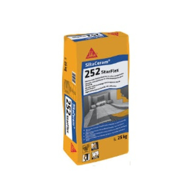 iva incl.CADUCIDAD 12 MESES##Palet=42sacos##Descripción: adhesivo cementoso de consistencia variable, deformable, monocomponte de altas prestaciones, listo para su empleo con la sola adición de agua, para la colocación de piezas cerámicas. Consistencia fluida clasificación C2ES1 según EN 12004.#Consistencia tixotrópica con clasificación C2TES1 según EN 12004##Usos:##SikaCeram®-252 StarFlex es adecuado para el pegado de los siguientes tipos de baldosas:# #Gres porcelánico#Piezas de baja absorción#Placas de vidrio celular#Colocación de piedra natural#Colocación de mosaico vítreo#Colocación de cerámica de gran formato#En suelos con calefacción radiante#Piscinas#Suelos con tráfico pesado#Pegado de cerámica nueva sobre antigua##SikaCeram®-252 StarFlex se usa sobre los siguientes soportes:# #Mortero u hormigón y ladrillo siempre que tengan buena planeidad.#Yeso y cartón yeso#Pegado de cerámica nueva sobre antigua#Soportes de anhidrita utilizando previamente la imprimación SikaCeram® 10W Primer.##SikaCeram®-252 StarFlex puede usarse en los siguientes casos:# #Paredes y suelos en interiores y exteriores###Características:# #Excelente adherencia sobre soportes poco absorbentes#Fácil de usar con excelente trabajabilidad y consistencia tixotrópica, ClaseT#Tiempo abierto prolongado, Clase E#Alta deformabilidad Clase S1#Low dust, baja emisión de polvo###Consumo:##Depende de la planeidad y rugosidad del soporte, del tamaño de las plaquetas y de la técnica de pegado (pegado simple o doble).#Como guía en kilos de polvo por m2:##Llana : 6x6 mm 10x10 mm#Consumo: 3 Kg/m2 5 Kg/m2