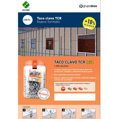 El Taco de Golpe TCR es un elemento esencial para la fijación segura de materiales en diversas superficies. Con dimensiones de 6 x 32mm y presentado en un bote que contiene 1000 unidades más 100 unidades de regalo, este producto es ideal para proyectos de construcción y bricolaje tanto a nivel profesional como doméstico.